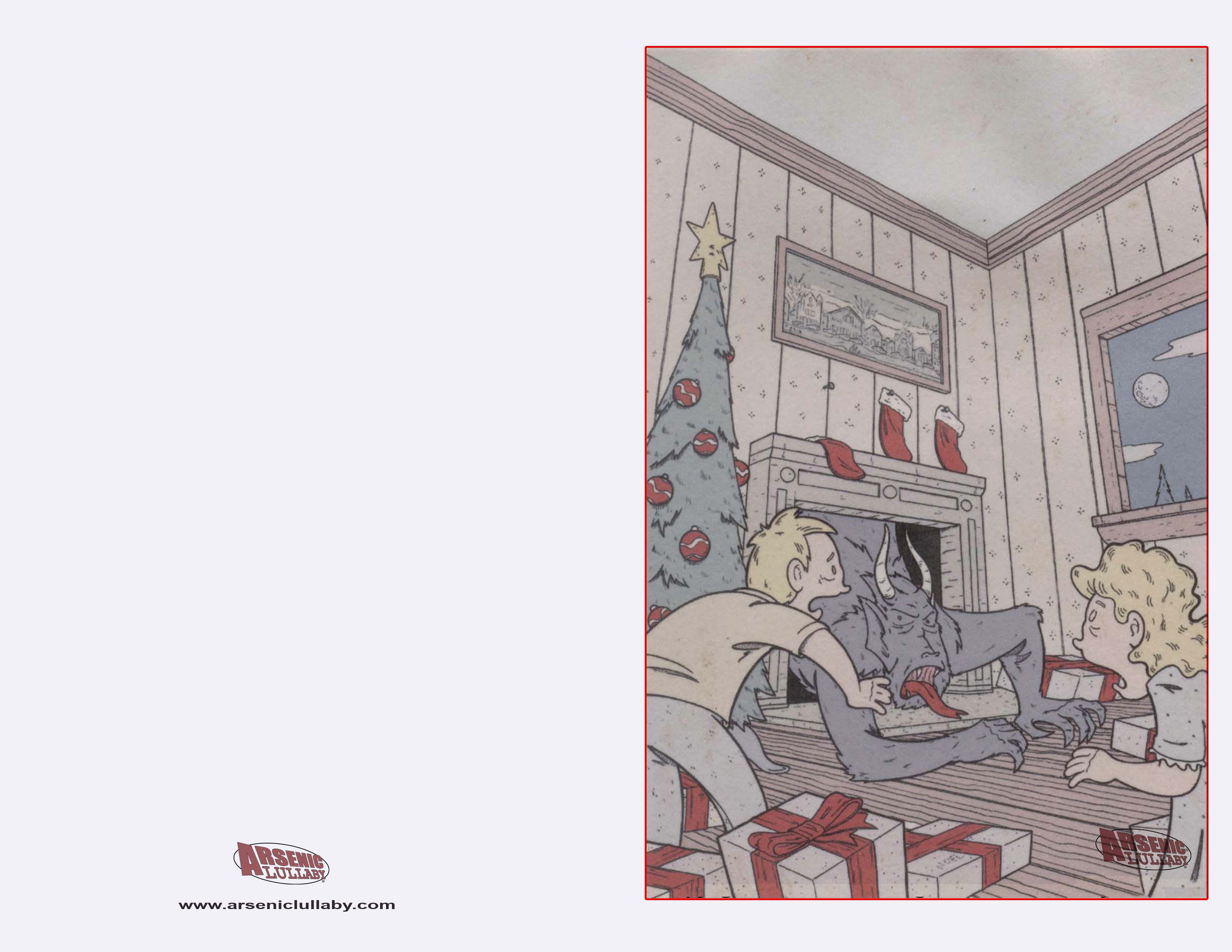 X-MAS CARDS By now Fb newsfeed is full of everybodies jolly ass X-mas pics and or ironically jolly pics (showing they are so happy they can afford to pretend they are not). Hell, your email box is probably filling up with "family newsletters" complete with ugly kids being forced to smile and pretend all is right with the world, and their parents aren't actually on the brink of divorce. Just for comsic balance, here's a few A.L. cards to use as you will (leave the logo on okay?) We have left some black/white for YOU to color them or one. go ahead...use photoshop, crayons, glitter, or ketchup and your finger...Merry freakin X-mas. (we have a coloring contest here if you are really good...or really bad)