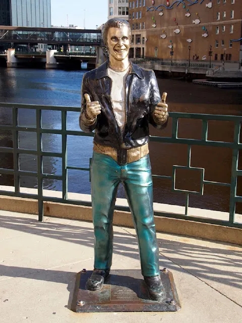 of mankind, is a bronze statue of... Fonzie.